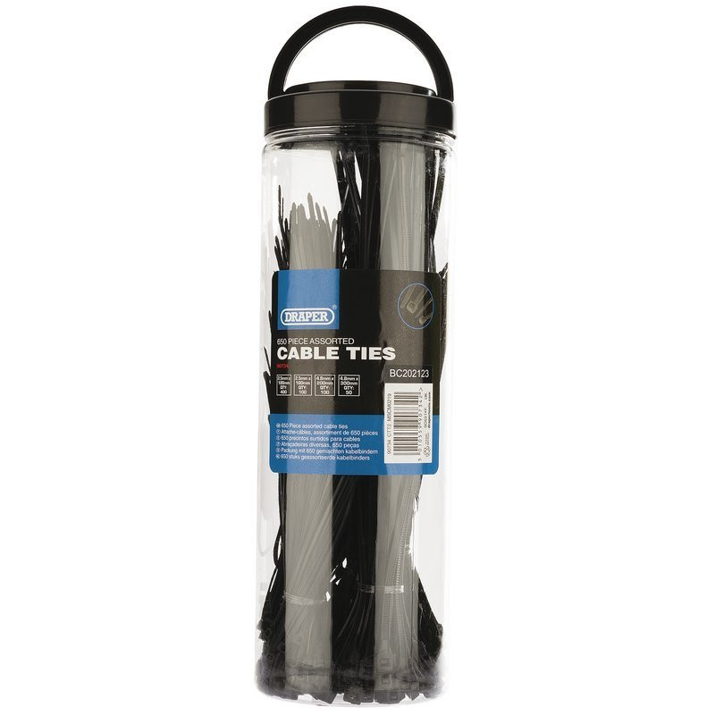 1 Quick view DRAPER 200 piece assorted cables ties - 90725 Price €6.90 Add to cart 1 Quick view Bag of zip ties 200mm length x 2.5mm / 100 pieces Price €9.90 Add to cart Brand: Draper 650 piece assorted cables ties - x400: 2.5mm x 100mm - x100: 2.5mm x 160mm - x100: 4.8mm x 200mm - x50: 4.8mm x 300mm
