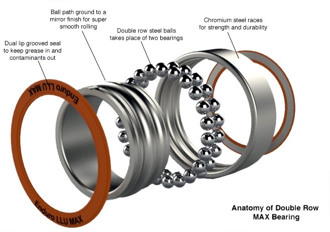 Conçu spécifiquement pour les pivots de suspension, Enduro Bearings ont été les pionniers du type MAX, il y a presque 20 ans, afin de relever les défis associés aux pivots de VTT. Ces roulements ont 35 à 40% de capacité de charge en plus que les roulements radiaux standard. Enduro Bearings réalise ceci avec une conception spéciale où le nombre maximal de billes est inséré dans le roulement. Les rainures de bagues sont plus profondes sur ces roulements pour plus de soutien latéral pour la torsion et de multiples forces associées aux pivots de VTT.