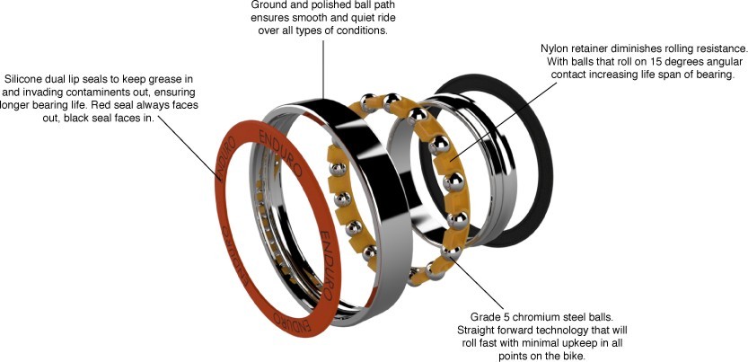 Enduro Bearings fabrique une gamme de roulements à cartouches angulaires (AC) spécialement conçus pour les moyeux et boitiers de pédalier. Dans les roulements radiaux standard, seules 3 ou 4 billes font contact pendant la charge, à un moment donné. Dans les roulements à contact angulaire (A C), toutes les billes sont solicitées et répartissent la force sur une plus grande surface pour diminuer le frottement et minimiser l'usure. C'est fiable, demande peu d'entretien et très efficace.